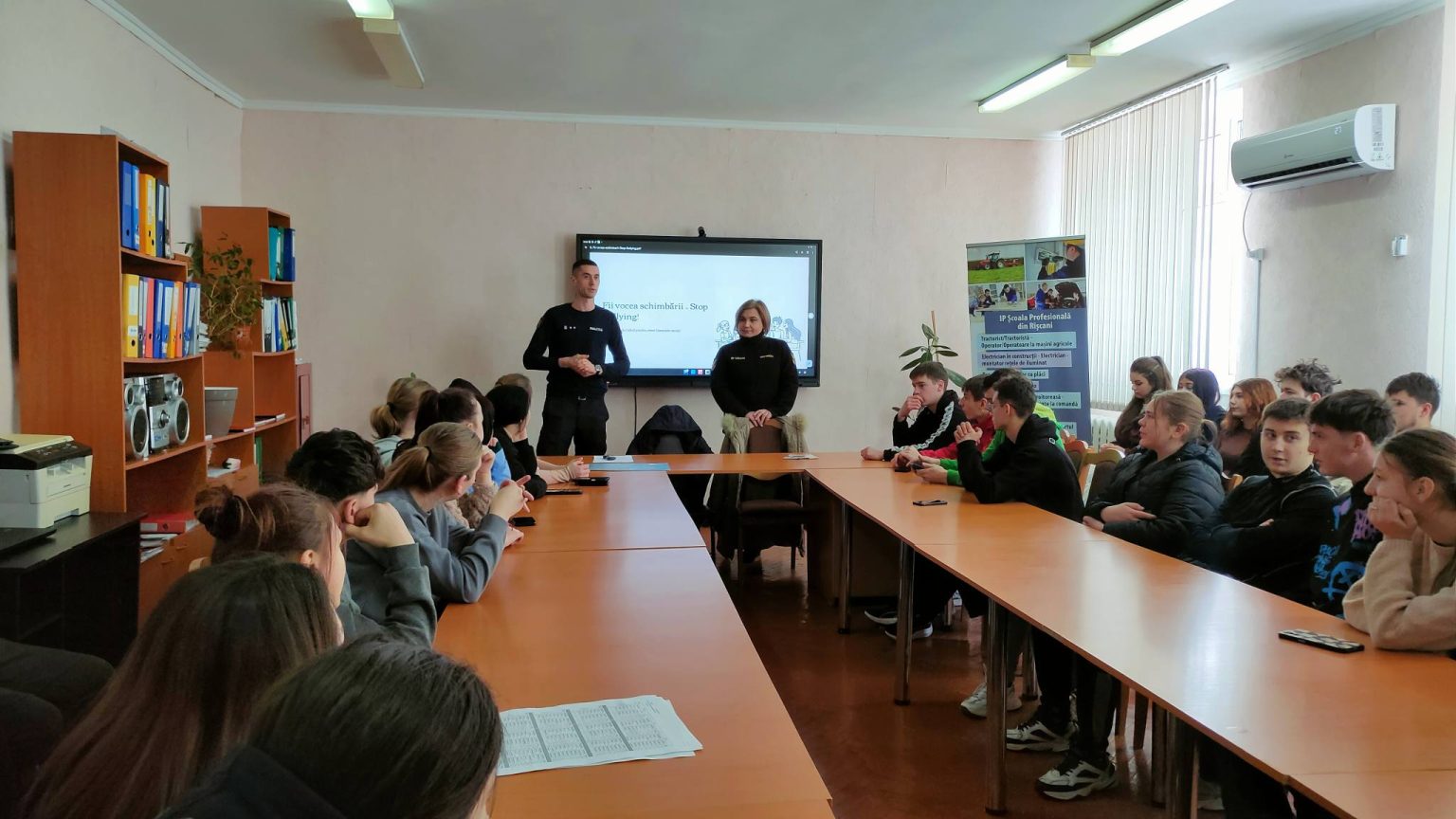 Activitatea a fost desfășurată de către reprezentanul Inspectoratul de Poliție Rîșcani Victor Nastas în comun cu reprezentantul Biroului de probațiune Drochia sediul Rîșcani, Юля Лопатински care le-au oferit elevilor exemple concrete, îndrumări utile și i-au încurajat să aibă curajul de a spune „STOP” comportamentelor agresive și de a cere ajutor atunci când este nevoie.